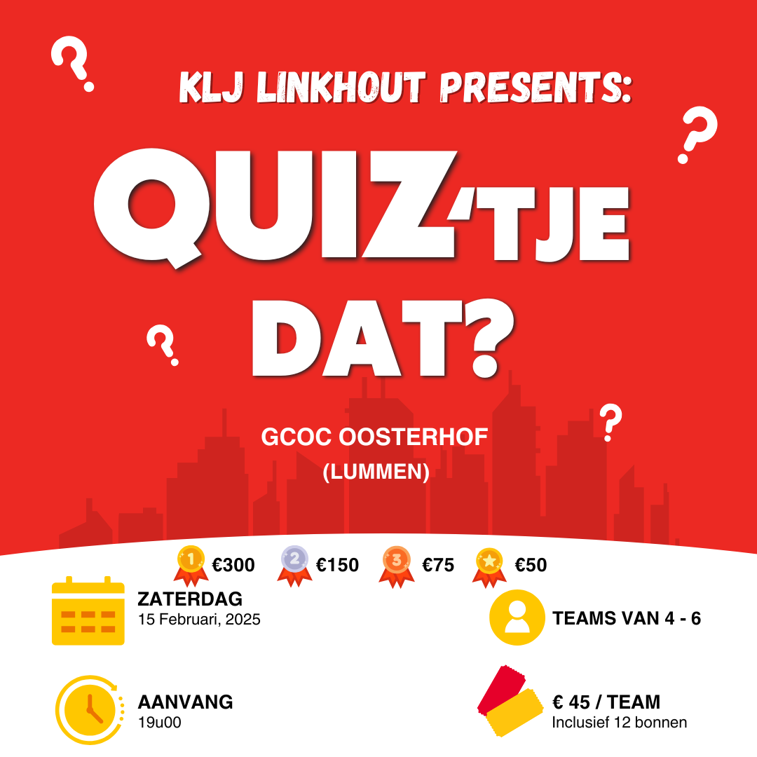 Ben jij klaar om je kennis te testen? Dan is deze quiz echt iets voor jou! Quiz samen met je team naar de overwinning en maak kans op fantastische prijzen. Klaar om je quizskills naar een hoger niveau te tillen?